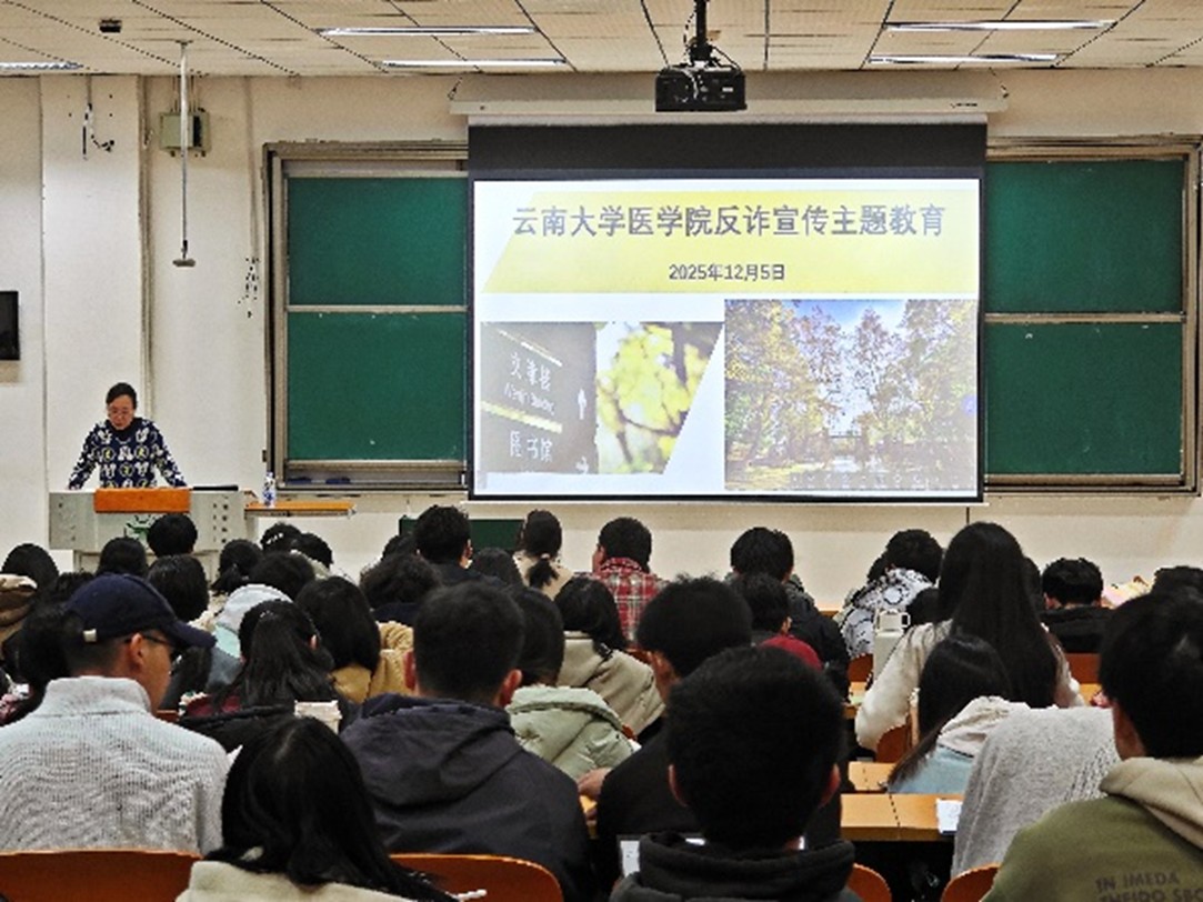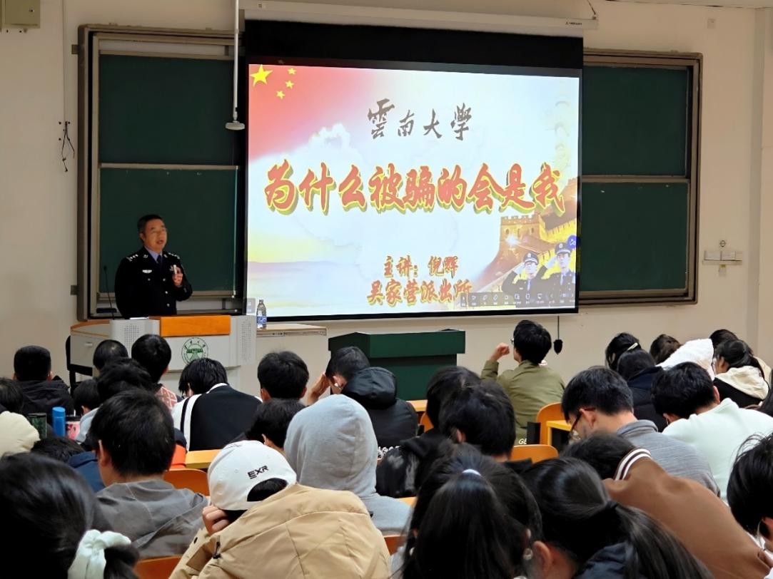 为全面提升学生反诈防骗意识,切实维护校园安全与学生财产安全,2025年12月5日晚,云南大学医学院在文汇楼2218阶梯教室组织开展反诈宣传主题教育活动,特邀昆明市公安局呈贡分局吴家营派出所社区民警倪辉警官作专题宣讲。医学院党委副书记卫纯、呈贡校区全体学生在文汇楼2218阶梯教室线下参加活动,东陆校区2022级本科生通过线上方式参加。学工办主任胡艳芳主持会议。