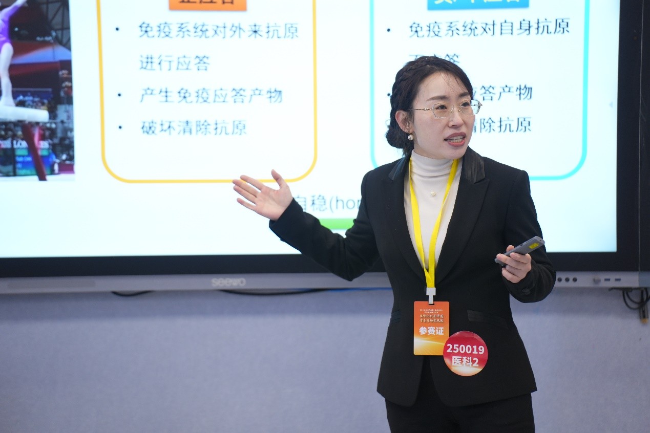 比赛中,张尊月老师紧扣临床医学专业特点,以清晰严谨的教学逻辑构建课程框架,将复杂的医学免疫学理论与生动的临床案例深度融合。其授课过程条理分明、重点突出,不仅展现了扎实的专业储备,更通过贴近临床实际的教学内容,有效激发了学生的探究兴趣与临床思维。